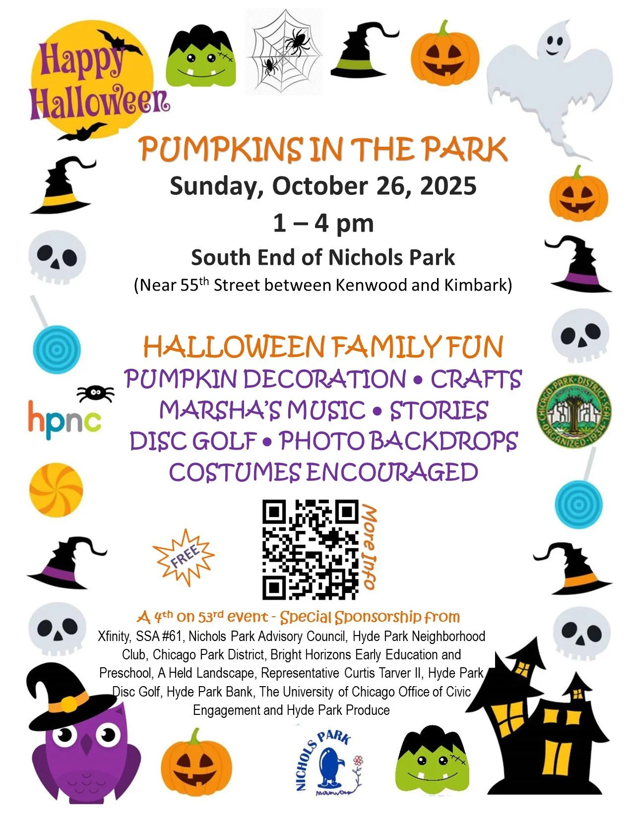 'Pumpkins in the Park' returns to Nichols Park on Sunday, Oct 26th, 1 PM -4PM. Southern end of Nichols Park, near 55th Street and the Hyde Park Neighborhood Club.